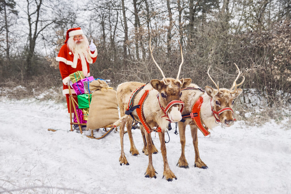 Der Weihnachtsmann kommt mit seinen Rentieren